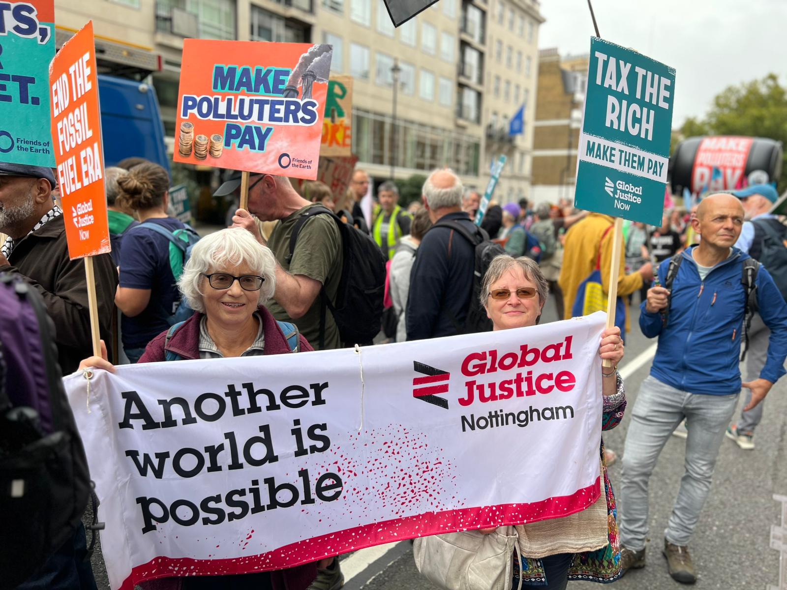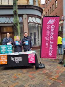 Along with Friends of the Earth and XR Nottingham, we had stalls in central Nottingham calling for climate justice, with corporations and billionaires paying their share, and a just transition for workers and communities globally. We also called for secret Corporate Courts to be excluded form future trade deals. They subvert democracy and inhibit governments from taking climate action.